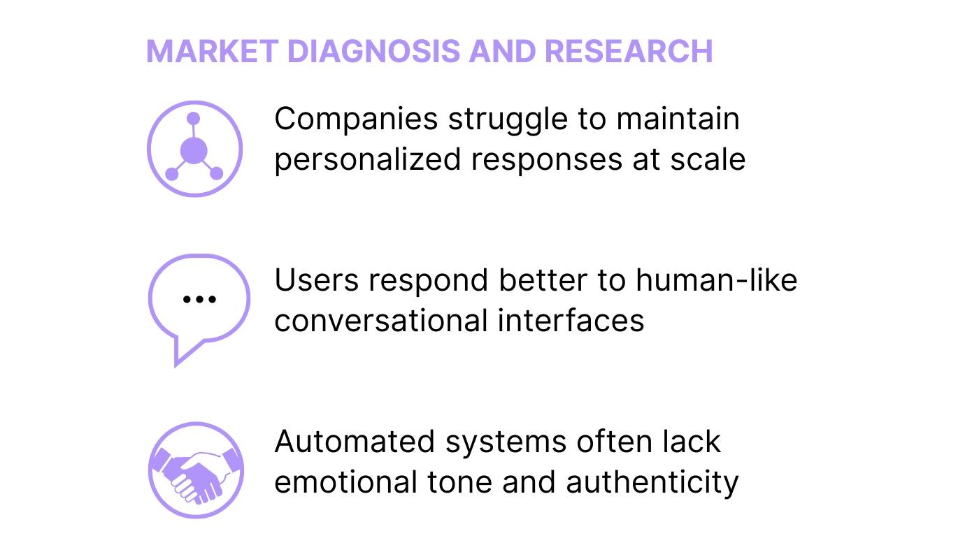 The project focused on designing a scalable chatbot interface capable of automating marketing and support workflows while maintaining a human-centered tone. Through market analysis, interaction modeling, and usability testing, the system was structured to optimize operational efficiency and reduce friction in repetitive processes.